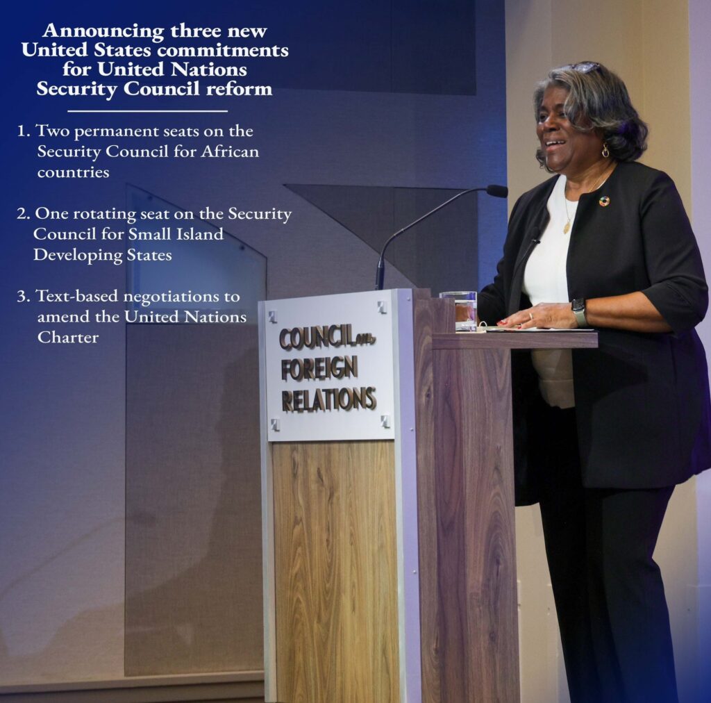 उन्होंने विदेश संबंध परिषद के कार्यक्रम में ‘बहुपक्षवाद और संयुक्त राष्ट्र सुधार का भविष्य’ विषय पर चर्चा के दौरान घोषणा की कि अमेरिका छोटे द्वीपीय विकासशील देशों के लिए सुरक्षा परिषद में एक नई सीट के सृजन का समर्थन करता है। उन्होंने कहा कि जी-4 में ब्राजील, जर्मनी, भारत और जापान हैं। चारों देश संयुक्त राष्ट्र सुरक्षा परिषद की स्थायी सदस्यता के लिए एक-दूसरे के दावों का समर्थन करते हैं। थॉमस-ग्रीनफील्ड ने कहा, ”भारत दुनिया में सबसे बड़ी आबादी वाला देश है। अमेरिका परिषद में उसके शामिल होने का वास्तव में दृढ़ता से समर्थन करता है।मुझे लगता है कि भारत को सदस्यता देने से इनकार करने का कोई आधार नहीं है। मगर कतिपय लोग विभिन्न कारणों से विभिन्न देशों का विरोध करेंगे। हम आगे होने वाली बातचीत के दौरान इसपर भी बात करेंगे”