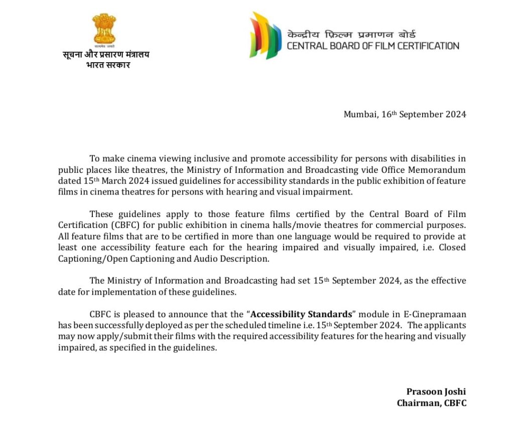 इस दिशा में कदम उठाते हुए ई-सिनेप्रमाण मॉड्यूल जारी किया है। आवेदक अब दिशा-निर्देशों में निर्दिष्ट अनुसार श्रवण और दृष्टिबाधित लोगों के लिए आवश्यक एक्सेसिबिलिटी सुविधाओं के साथ अपनी फिल्में लागू एवं जमा कर सकते हैं। सूचना और प्रसारण मंत्रालय ने इन दिशा-निर्देशों के कार्यान्वयन के लिए प्रभावी तिथि 15 सितंबर 2024 निर्धारित की थी।