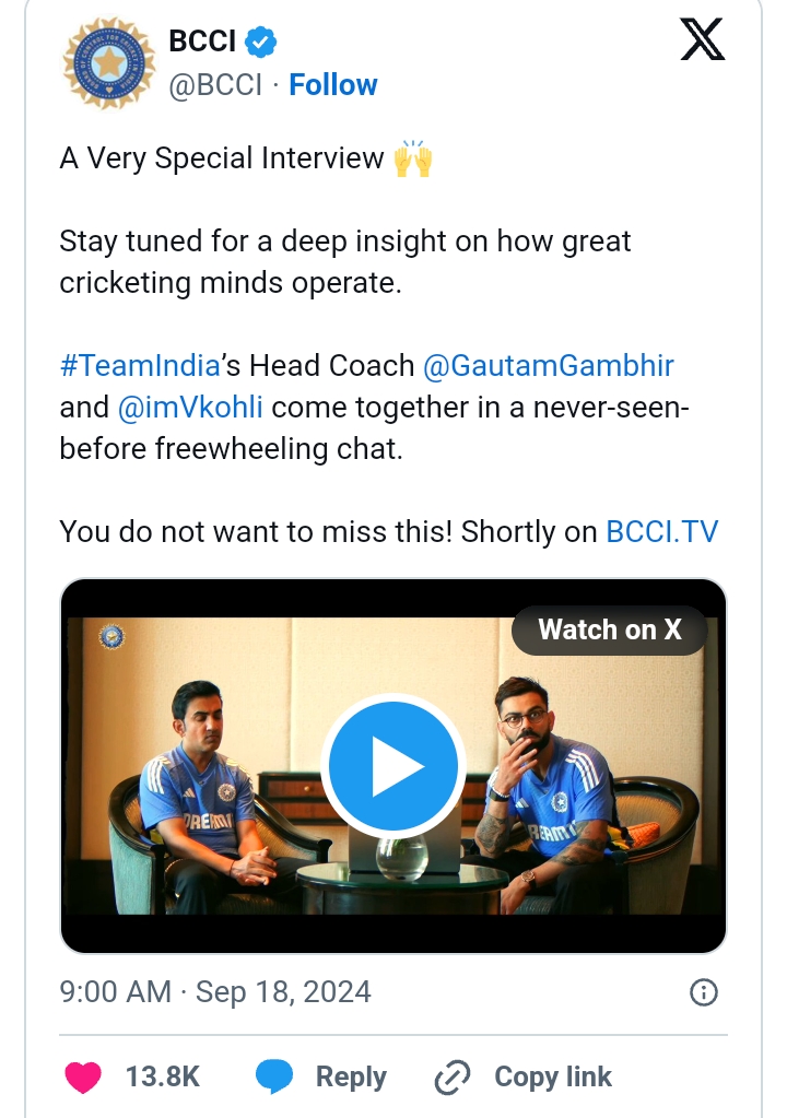 दोनों खेल दिग्गजों के बीच यह बातचीत बांग्लादेश के खिलाफ भारत की दो मैचों की टेस्ट सीरीज से पहले हुई है। बीसीसीआई द्वारा साझा किए गए टीज़र में कोहली ने गंभीर के साथ लंबे समय से चले आ रहे तनाव को लेकर बातचीत की शुरुआत करते हुए कहा, “तो हम यहां हैं। हम एक लंबा सफर तय कर चुके हैं और सभी मसाला खत्म कर रहे हैं।”