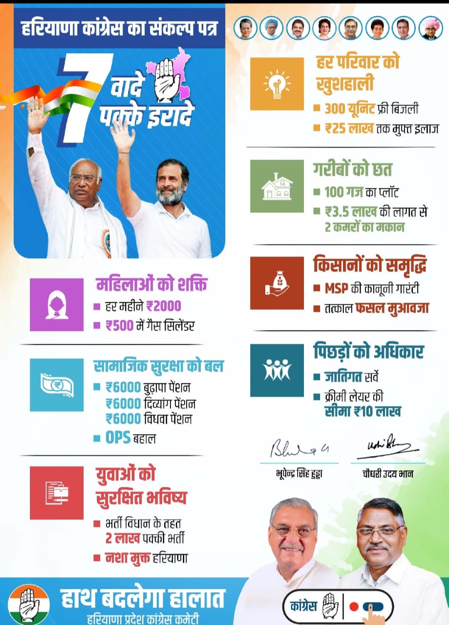 कांग्रेस मुख्यालय में पार्टी अध्यक्ष मल्लिकार्जुन खरगे की उपस्थिति में आज हरियाणा के लिए पार्टी का घोषणा पत्र जारी किया गया। इसमें कांग्रेस ने वादा किया है कि चुनाव जीतने पर पार्टी महिलाओं को प्रति महीने 2 हजार रुपये देगी और 500 रुपये में रसोई गैस सिलेंडर दिया जाएगा। सामाजिक सुरक्षा पर बल देते हुए बुढ़ापा, दिव्यांग और विधवाओं को 6 हजार रुपये की पेंशन देने की घोषणा की गई। सरकारी नौकरियों में पुरानी पेंशन योजना लागू की जाएगी। युवाओं को सुरक्षित भविष्य देने के लिए भर्ती विधान के तहत 2 लाख पक्की नौकरी दी जाएगी। हरियाणा को नशा मुक्त बनाया जाएगा। हर परिवार को 300 यूनिट बिजली फ्री और 25 लाख तक का मुफ्त इलाज उपलब्ध कराया जाएगा। गरीबों को छत देने के लिए 100 गज का प्लॉट, 3.5 लाख की लागत से दो कमरों का मकान दिया जाएगा। किसानों की स्मृद्धि के लिए एमएसपी की कानूनी गारंटी और तत्काल फसल मुआवजा दिया जाएगा। पिछड़ों को अधिकार देने के लिए जातिगत सर्वे कराया जाएगा। क्रीमी लेयर की सीमा को बढ़ाकर 10 लाख किया जाएगा।
