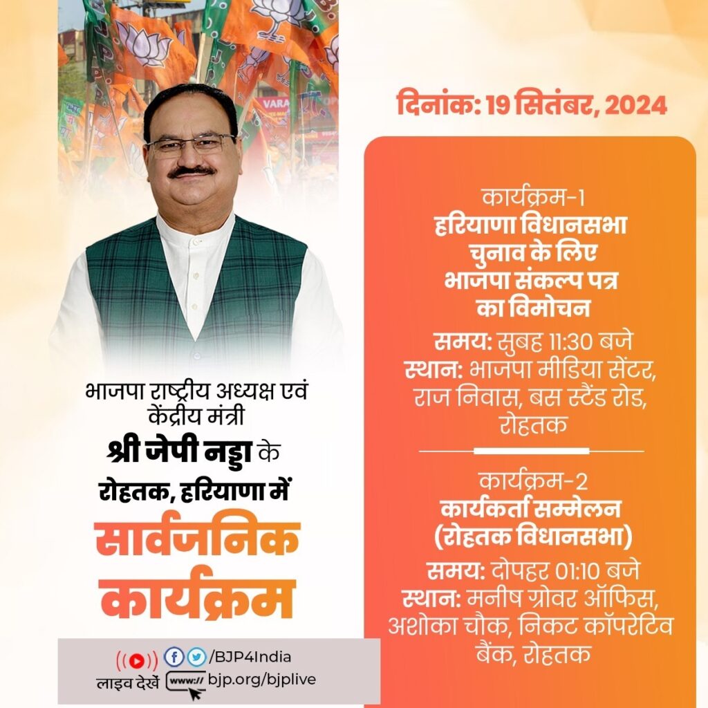 नई दिल्ली, 19 सितंबर । भारतीय जनता पार्टी (भाजपा) के राष्ट्रीय अध्यक्ष और केंद्रीय स्वास्थ्यमंत्री जेपी नड्डा आज हरियाणा के रोहतक पहुंच रहे हैं। वे वहां विधानसभा चुनाव के मद्देनजर पार्टी के संकल्प पत्र का विमोचन करेंगे। भारतीय जनता पार्टी ने नड्डा के आज के कार्यक्रम को एक्स हैंडल पर साझा किया है।