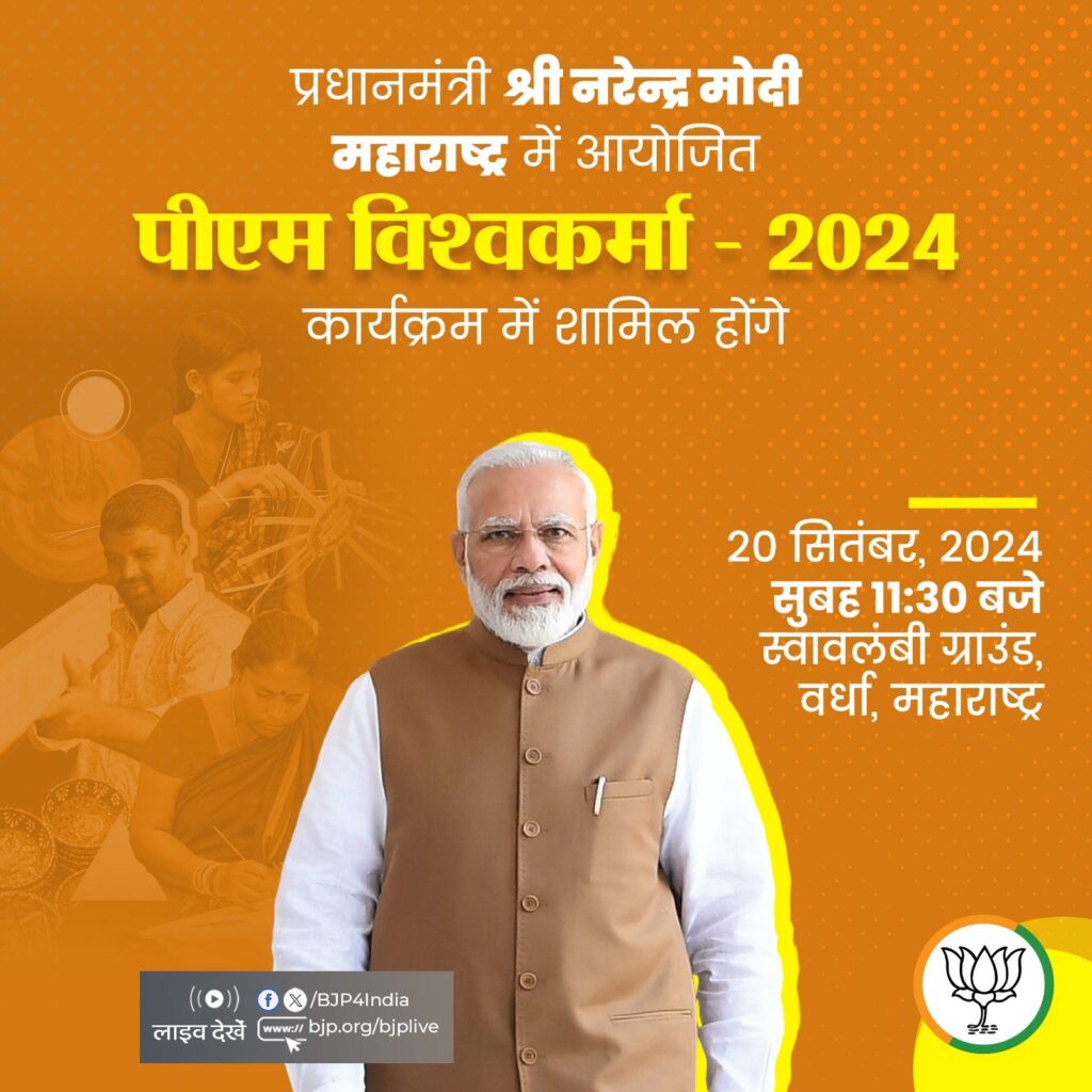 नई दिल्ली, 20 सितंबर । प्रधानमंत्री नरेन्द्र मोदी आज महाराष्ट्र के वर्धा और अमरावती पहुंच रहे हैं। वो सुबह करीब 11:30 बजे राष्ट्रीय ‘पीएम विश्वकर्मा’ कार्यक्रम में हिस्सा लेंगे। इस कार्यक्रम तहत प्रगति के एक वर्ष पूरे होने का उत्सव मनाया जाएगा। यह जानकारी भारत सरकार के पत्र सूचना कार्यालय (पीआईबी) की विज्ञप्ति में साझा की गई है। भारतीय जनता पार्टी (भाजपा) ने भी प्रधानमंत्री नरेन्द्र मोदी के आज के इस कार्यक्रम को एक्स हैंडल पर साझा किया है।