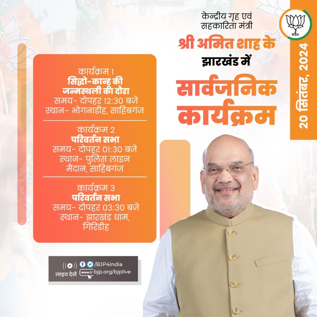 भाजपा के एक्स हैंडल के अनुसार, केंद्रीय गृहमंत्री अमित शाह दोपहर 12ः30 बजे भोगनाडीह साहिब जाएंगे। यहां से वो सिद्धो-कान्ह की जन्मस्थली का दौरा करेंगे। उनकी परिवर्तन सभा भी साहिबगंज के पुलिस लाइन मैदान पर होनी है। इसका समय दोपहर डेढ़ बजे रखा गया है। भाजपा नेता शाह की दूसरी जनसभा गिरिडीह के झारखंडधाम में होनी है। इसका समय अपराह्न साढ़े तीन बजे तय किया गया है।