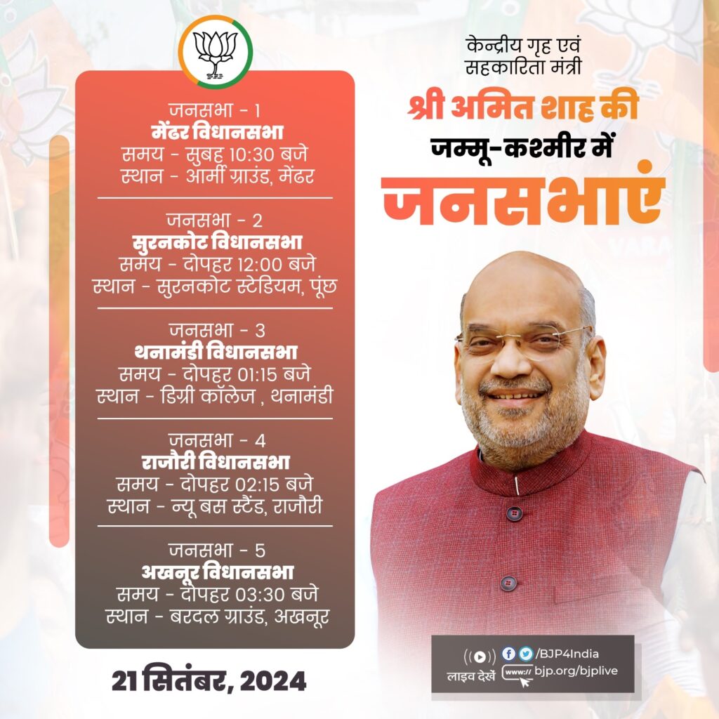 भाजपा के एक्स हैंडल पर उपलब्ध विवरण में बताया गया है कि शाह आज सुबह 10ः30 बजे मेंढर के आर्मी ग्राउंड में पार्टी की जनसभा को संबोधित करेंगे। इसके बाद वो सुरनकोट विधानसभा क्षेत्र में प्रचार के लिए पहुंचेंगे। यहां वो दोपहर 12 बजे सुरनकोट स्टेडियम में जनता से रूबरू होंगे। शाह दोपहर सवा एक बजे थनामंडी विधानसभा क्षेत्र में होंगे। डिग्री कालेज थनामंडी में उनकी जनसभा होगी। स्टार प्रचारक शाह राजौरी विधानसभा क्षेत्र में सवा दो बजे मतदाताओं से विभाजनकारी ताकतों को चुनाव में हराने की अपील करेंगे। न्यू बस स्टैंड राजौरी में उनकी जनसभा होगी। केंद्रीय गृहमंत्री शाह सबसे आखिर में अपराह्न साढ़े तीन बजे अखनूर के बदरल ग्राउंड में भाजपा की जनसभा में केंद्र की मोदी सरकार की नीतियों से अवगत कराएंगे।