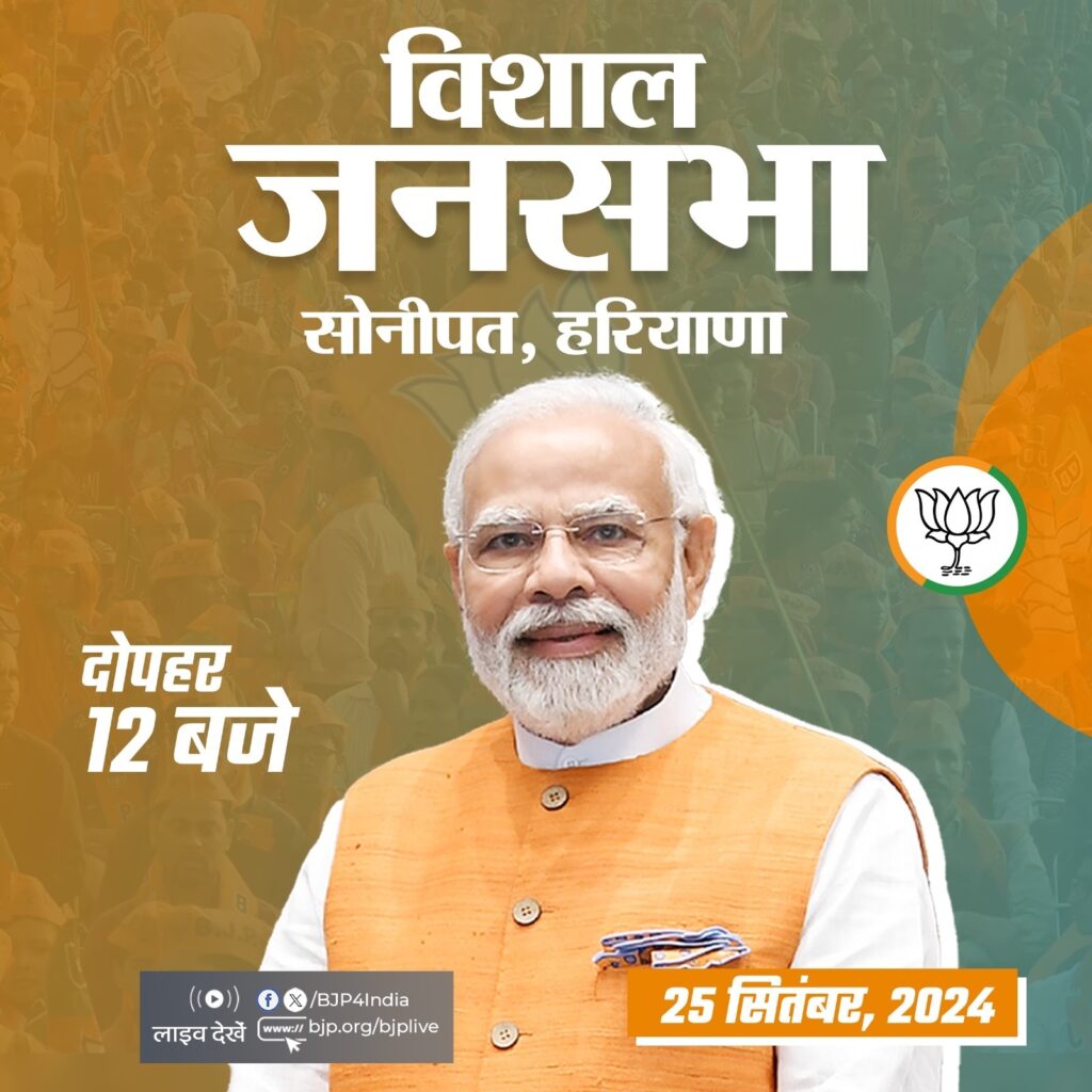 नई दिल्ली, 25 सितंबर । भारतीय जनता पार्टी (भाजपा) के शीर्ष नेता, सबसे बड़े स्टार प्रचारक और प्रधानमंत्री नरेन्द्र मोदी आज विधानसभा चुनाव प्रचार के लिए हरियाणा पहुंच रहे हैं। वो दोपहर 12 बजे हरियाणा के सोनीपत जिले के गोहाना में जनसभा को संबोधित करेंगे। अगले दिन प्रधानमंत्री मोदी ऑडियो ब्रिज के माध्यम से हरियाणा भाजपा के कार्यकर्ताओं से संवाद करेंगे। प्रधानमंत्री के सोनीपत कार्यक्रम की सूचना भाजपा ने एक्स हैंडल पर साझा की है।