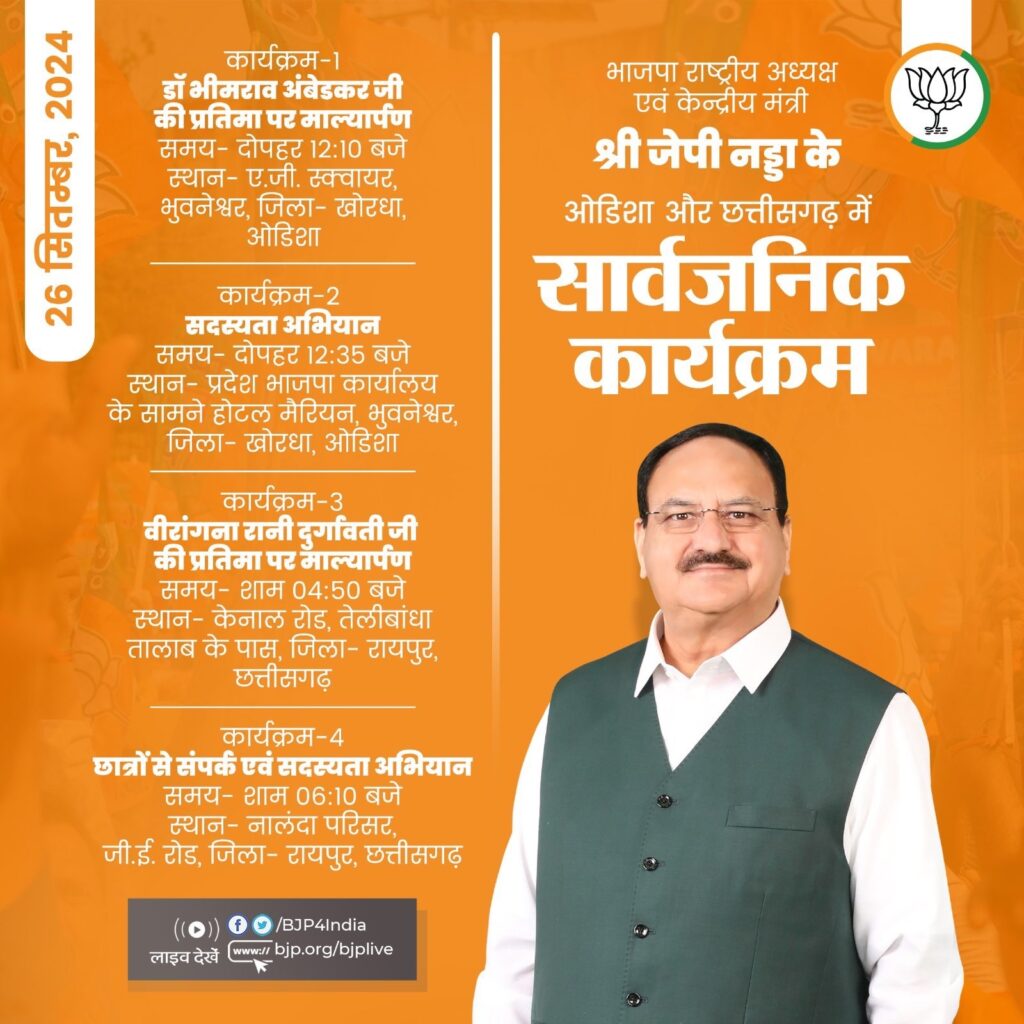 नई दिल्ली, 26 सितंबर । भारतीय जनता पार्टी (भाजपा) के राष्ट्रीय अध्यक्ष और केंद्रीय स्वास्थ्यमंत्री जेपी नड्डा आज दो राज्यों ओडिशा और छत्तीसगढ़ के दौरे पर पहुंच रहे हैं। उनके कार्यक्रम का ब्यौरा भाजपा ने एक्स हैंडल पर साझा किया है।