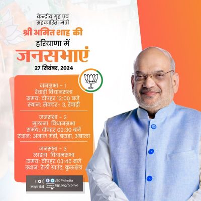 नई दिल्ली, 27 सितंबर । भारतीय जनता पार्टी (भाजपा) के वरिष्ठ नेता, स्टार प्रचारक और केंद्रीय गृह एवं सहकारितामंत्री अमित शाह आज हरियाणा में जनसभाओं को संबोधित करेंगे। वह तीन विधानसभा क्षेत्रों में चुनाव प्रचार करेंगे। भाजपा ने एक्स हैंडल में शाह के आज के कार्यक्रम को साझा किया है।