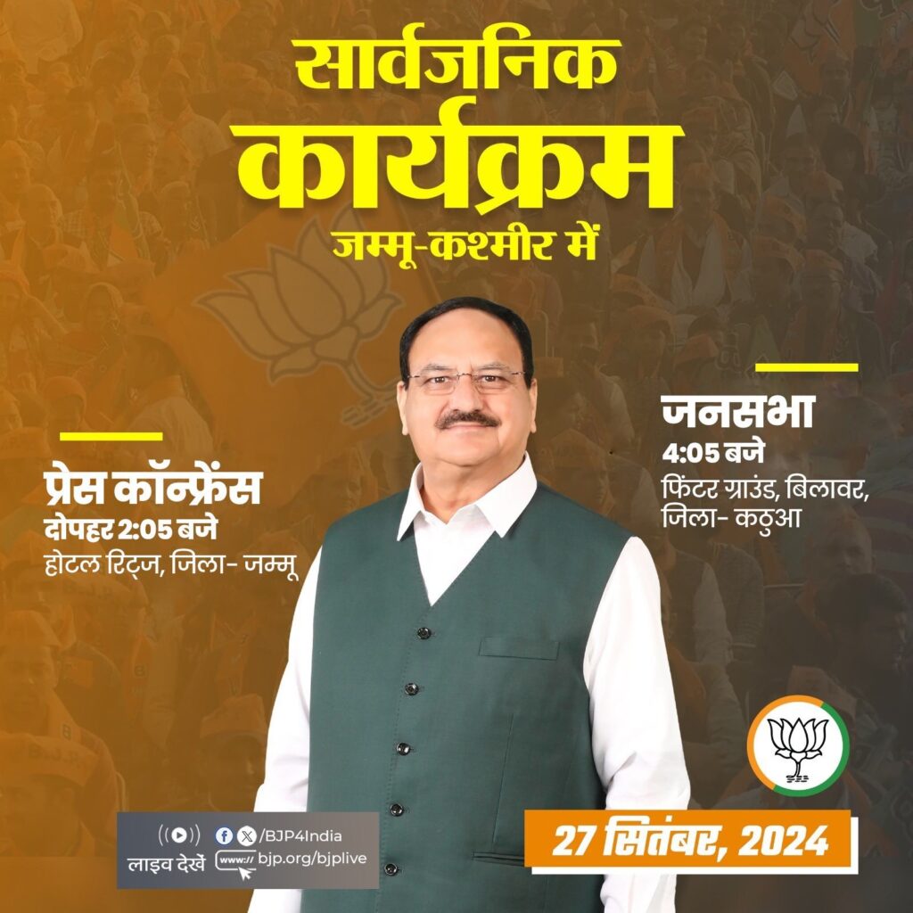 भाजपा के अनुसार, राष्ट्रीय अध्यक्ष जेपी नड्डा की प्रेस कॉन्फ्रेंस जम्मू जिले के रिट्ज होटल में दोपहर दो बजकर पांच मिनट पर शुरू होगी। इसके बाद नड्डा चुनाव प्रचार के लिए कठुआ पहुंचेंगे। वो शाम 4ः05 बजे कठुआ के बिलावर में जनसभा को संबोधित करेंगे।