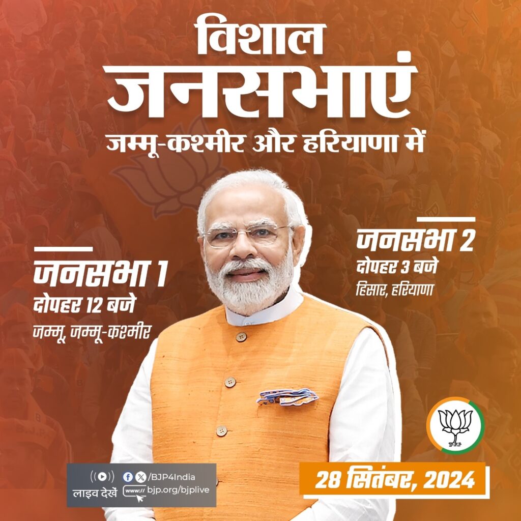 भाजपा के एक्स हैंडल के अनुसार, प्रधानमंत्री नरेन्द्र मोदी आज चुनाव प्रचार का श्रीगणेश जम्मू-कश्मीर की ग्रीष्मकालीन राजधानी जम्मू से करेंगे। वो दोपहर 12 बजे जम्मू में विशाल जनसभा को संबोधित करेंगे। यहां से प्रधानमंत्री मोदी हरियाणा पहुंचेंगे। वो दूध-दही का खाणा-ये है हरियाणा के नाम से मशहूर के हिसार में अपराह्न तीन बजे जनसभा को संबोधित करेंगे। दोनों राज्यों के भाजपा नेतृत्व ने प्रधानमंत्री की रैली के लिए जोरदार तैयारी की है। प्रधानमंत्री की जनसभाओं के मद्देनजर केंद्रीय सुरक्षा एजेंसियों के अलावा राज्यों ने भी सुरक्षा का तगड़ा बंदोबस्त किया है।