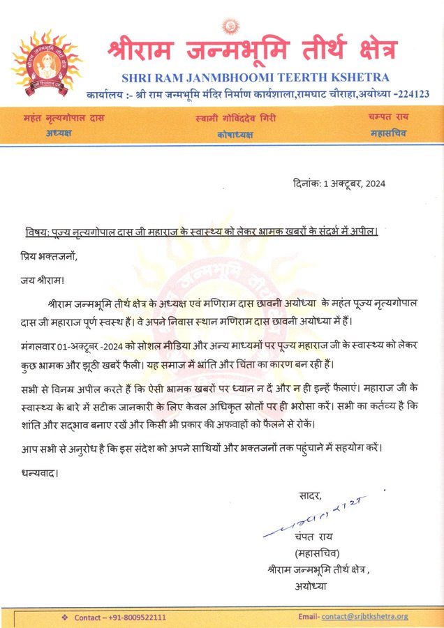 देश श्री राम जन्मभूमि तीर्थ क्षेत्र न्यास के माननीय अध्यक्ष पूज्य महंत श्री नृत्यगोपाल दासजी महाराज के स्वास्थ्य के विषय मे आधिकारिक वक्तव्य Lok Swaraj24 October 1, 2024 Spread the loveश्री राम जन्मभूमि तीर्थ क्षेत्र न्यास के माननीय अध्यक्ष पूज्य महंत श्री नृत्यगोपाल दासजी महाराज के स्वास्थ्य के विषय मे आधिकारिक वक्तव्य Post navigation Previous FAU-G: भारत में बने इस गेम ने रिलीज़ होने से पहले ही एक नया रिकॉर्ड बना दिया है.Next हरियाणा में फिर से गर्मी का वार, पारा 38 डिग्री के पार Related Stories शास्त्र और शस्त्र के महानायक: भगवान श्री परशुराम जन्मोत्सव देश शास्त्र और शस्त्र के महानायक: भगवान श्री परशुराम जन्मोत्सव April 19, 2026 परशुराम जन्मोत्सव से गंगा अवतरण तक: अक्षय तृतीया का दिव्य इतिहास देश परशुराम जन्मोत्सव से गंगा अवतरण तक: अक्षय तृतीया का दिव्य इतिहास April 19, 2026 इतिहास के पन्नों में 20 अप्रैल : क्रूरतम तानाशाह ‘एडोल्फ हिटलर’ का जन्मदिन FEATURED देश इतिहास के पन्नों में 20 अप्रैल : क्रूरतम तानाशाह ‘एडोल्फ हिटलर’ का जन्मदिन April 19, 2026