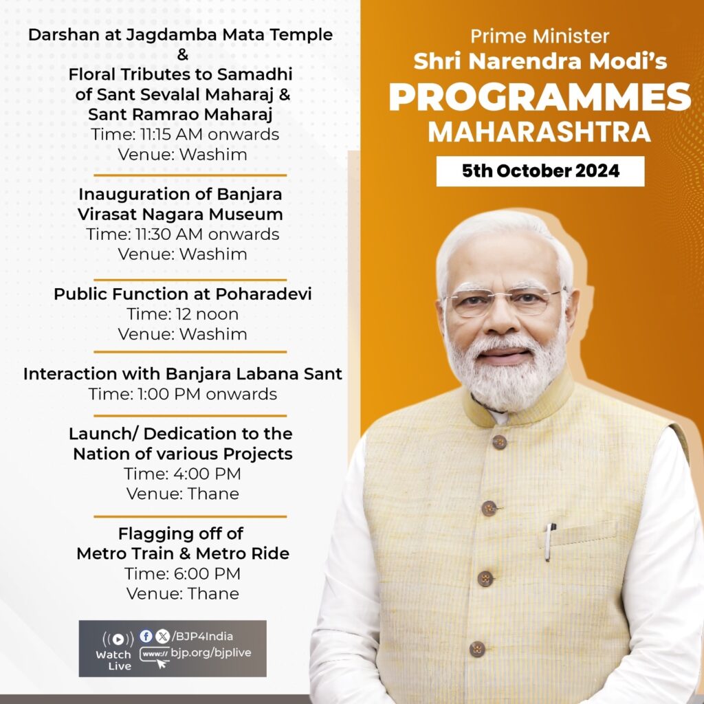 नई दिल्ली, 05 अक्टूबर । प्रधानमंत्री नरेन्द्र मोदी आज महाराष्ट्र के दौरे पर पहुंच रहे हैं। वो वाशिम में पूर्वाह्न करीब 11:15 बजे पोहरादेवी स्थित जगदम्बा माता मंदिर में दर्शन करेंगे। इसके बाद संत सेवालाल महाराज और संत रामराव महाराज की समाधि पर श्रद्धांजलि अर्पित करेंगे। पूर्वाह्न करीब 11:30 बजे प्रधानमंत्री बंजारा विरासत म्यूजियम (संग्रहालय) का उद्घाटन करेंगे। इसमें बंजारा समुदाय की समृद्ध विरासत को प्रदर्शित किया जाएगा। वो इस दौरान 56,000 करोड़ रुपये से अधिक लागत की अनेक विकास परियोजनाओं का शुभारंभ करेंगे। प्रधानमंत्री के आज के कार्यक्रम को भारतीय जनता पार्टी (भाजपा) ने एक्स हैंडल पर साझा किया है। भारत सरकार के पत्र सूचना कार्यालय (पीआईबी) की विज्ञप्ति में प्रधानमंत्री मोदी के कार्यक्रम की विस्तृत जानकारी दी गई है।