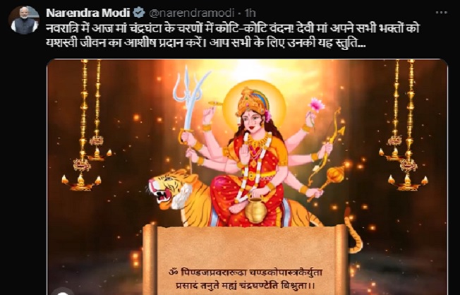 प्रधानमंत्री मोदी ने एक्स हैंडल पोस्ट पर मां की स्तुति का एक वीडियो भी अपलोड किया है। लोक मान्यता है कि नवरात्रि के तीसरे दिन मां दुर्गा के तीसरे स्वरूप चंद्रघंटा के विग्रह की पूजा-अर्चना की जाती है। मां चंद्रघंटा के वंदन से मन को परम सूक्ष्म ध्वनि सुनाई देती है। इनका वर्ण स्वर्ण जैसा चमकीला है और यह आसुरी शक्तियों के विनाश के लिए सदैव तत्पर रहती हैं। इसलिए इनकी आराधना करने वाले को भी अपूर्व शक्ति का अनुभव होता है। मां चंद्रघंटा की पूजा करने से भक्तों को तेज और ऐश्वर्य की प्राप्ति होती है।