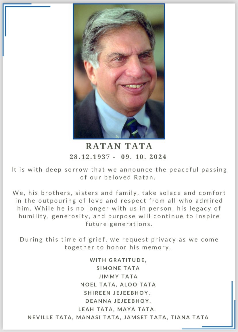 उन्होंने आगे कहा कि “टाटा समूह के लिए रतन टाटा एक चेयरपर्सन से कहीं अधिक थे। मेरे लिए वह एक गुरु, मार्गदर्शक और मित्र थे। उन्होंने उदाहरण पेश कर प्रेरित किया। उत्कृष्टता, अखंडता और नवाचार के प्रति अटूट प्रतिबद्धता के साथ टाटा समूह ने उनके नेतृत्व में अपने वैश्विक पदचिह्न का विस्तार किया। वह हमेशा अपने नैतिक सिद्धांतों के प्रति सच्चे रहे।”