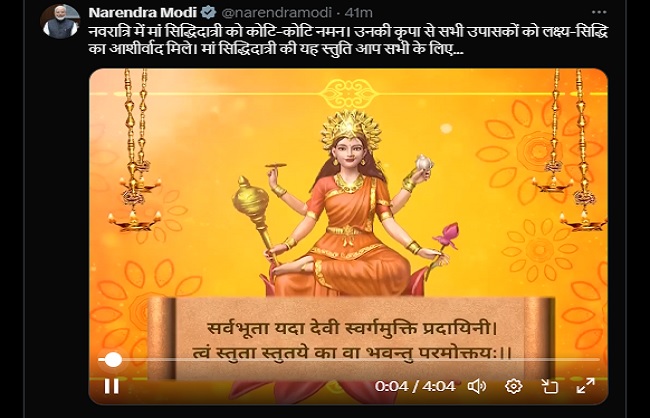 नई दिल्ली, 11 अक्टूबर । प्रधानमंत्री नरेन्द्र मोदी विदेश (लाओस) प्रवास के दौरान आज सुबह व्यस्तता के बीच नवरात्रि पर मां सिद्धिदात्री को याद करना नहीं भूले। उन्होंने सभी उपासकों को आशीर्वाद प्रदान करने के लिए मां की स्तुति की। उन्होंने शारदीय नवरात्रि के समापन पर आज एक्स हैंडल पर लिखा,” नवरात्रि में मां सिद्धिदात्री को कोटि-कोटि नमन। उनकी कृपा से सभी उपासकों को लक्ष्य-सिद्धि का आशीर्वाद मिले।”