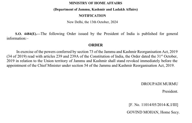 गृह मंत्रालय ने आदेश में कहा, “जम्मू और कश्मीर पुनर्गठन अधिनियम, 2019 की धारा 54 के तहत केंद्र शासित प्रदेश जम्मू और कश्मीर के संबंध में 31 अक्टूबर, 2019 का आदेश मुख्यमंत्री की नियुक्ति से तुरंत पहले रद्द कर दिया जाएगा।” 13 अक्टूबर, 2024 के नवीनतम आदेश ने केंद्र के 5 साल पुराने आदेश को रद्द कर दिया। इस आदेश के क्रियान्वयन के साथ ही उमर अब्दुल्ला के नेतृत्व वाली नई सरकार को आगामी सप्ताह में शपथ लेने की आधिकारिक मंजूरी मिल गई है।