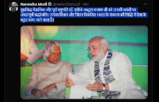 नई दिल्ली, 15 अक्टूबर । प्रधानमंत्री नरेन्द्र मोदी ने आज पूर्व राष्ट्रपति और दुनियाभर में मिसाइल मैन के नाम से विख्यात डॉ. एपीजे अब्दुल कलाम को उनकी जयंती पर श्रद्धांजलि दी। प्रधानमंत्री ने एक्स हैंडल पर लिखा,” सुप्रसिद्ध वैज्ञानिक और पूर्व राष्ट्रपति डॉ. एपीजे अब्दुल कलाम जी को उनकी जयंती पर आदरपूर्ण श्रद्धांजलि। उनका विजन और चिंतन विकसित भारत के संकल्प की सिद्धि में देश के बहुत काम आने वाला है।”