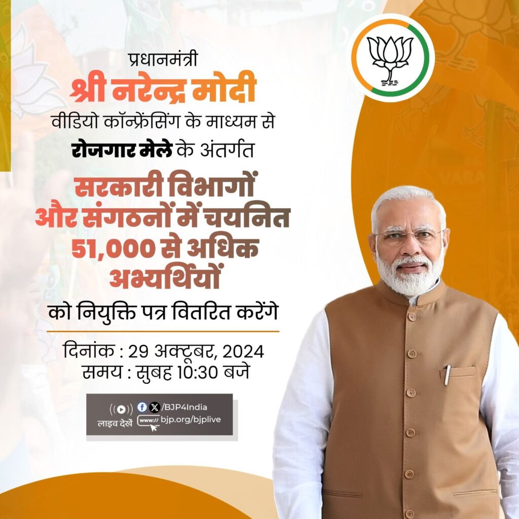 नई दिल्ली, 29 अक्टूबर । प्रधानमंत्री नरेन्द्र मोदी आज सुबह 10:30 बजे रोजगार मेला में वीडियो कॉन्फ्रेंसिंग के माध्यम से 51,000 से अधिक चयनित अभ्यर्थियों को नियुक्ति पत्र वितरित करेंगे। प्रधानमंत्री रोजगार मेला को संबोधित भी करेंगे। इस आयोजन की पूर्व संध्या पर भारत सरकार के पत्र एवं सूचना कार्यालय (पीआईबी) ने यह जानकारी दी। भारतीय जनता पार्टी (भाजपा) ने भी कार्यक्रम का ब्योरा एक्स हैंडल पर साझा किया है।