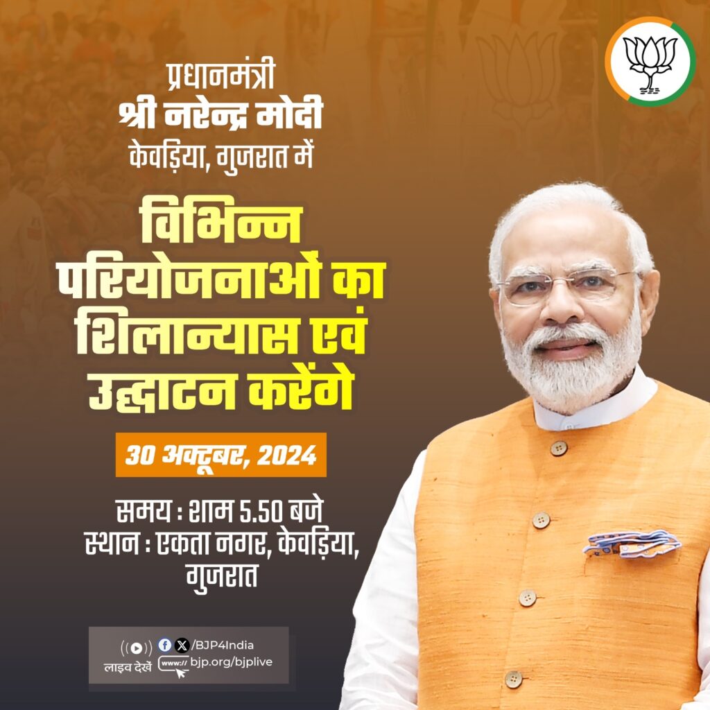 पत्र एवं सूचना कार्यालय की विज्ञप्ति के अनुसार, प्रधानमंत्री आज केवड़िया के एकता नगर में शाम करीब 5:30 बजे 280 करोड़ रुपये से अधिक की लागत की विभिन्न अवसंरचना और विकास परियोजनाओं का उद्घाटन और शिलान्यास करेंगे। वो शाम करीब छह बजे राष्ट्रीय एकता दिवस की पूर्व संध्या पर 99वें कॉमन फाउंडेशन कोर्स के प्रशिक्षु अधिकारियों को संबोधित करेंगे। इस वर्ष के कार्यक्रम का विषय आत्मनिर्भर और विकसित भारत के लिए रोडमैप है। 99वें कॉमन फाउंडेशन कोर्स-आरंभ 6.0- में भारत की 16 सिविल सेवाओं और भूटान की 3 सिविल सेवाओं के 653 अधिकारी प्रशिक्षु शामिल हैं।