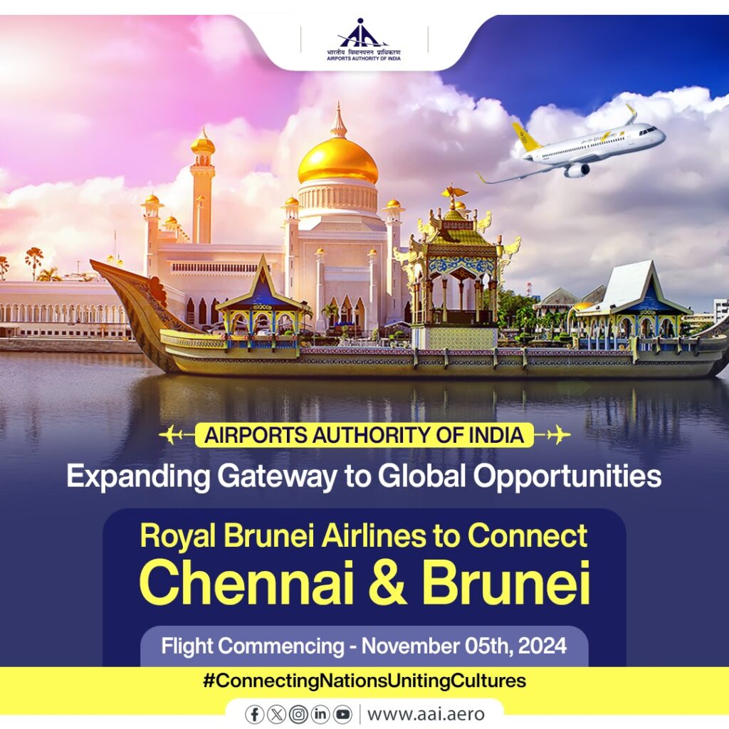 दक्षिण-पूर्व एशियाई देश – ब्रुनेई ने चेन्नई से रॉयल ब्रुनेई एयरलाइंस की पहली सीधी उड़ान के यात्रियों का ब्रुनेई अंतर्राष्ट्रीय हवाई अड्डे पर सांस्कृतिक स्वागत के साथ स्वागत किया है। एक प्रेस विज्ञप्ति में, ब्रुनेई पर्यटन विकास विभाग ने कहा कि इस सीधी उड़ान के शुरू होने से भारत से आने वाले पर्यटकों की बढ़ती प्रवृत्ति को बल मिलने की उम्मीद है। इसने यह भी कहा कि नया मार्ग अधिक सुविधाजनक यात्रा विकल्प प्रदान करेगा, जिससे आने वाले वर्षों में भारत से अधिक से अधिक पर्यटक आएंगे।