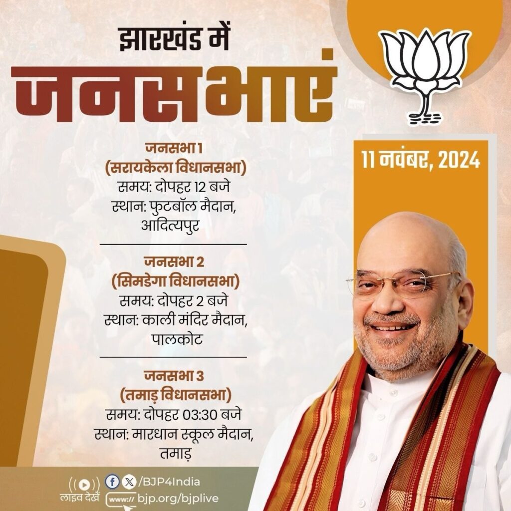 भाजपा के अनुसार, पार्टी के वरिष्ठ नेता अमित शाह आज दोपहर 12 बजे सरायकेला विधानसभा क्षेत्र के आदित्यपुर में जनसभा को संबोधित करेंगे। यहां से वो सिमगेडा विधानसभा क्षेत्र जाएंगे। शाह इस विधानसभा क्षेत्र के पालकोट में अपराह्न दो बजे रैली में जनता से मुखातिब होंगे। भाजपा नेता यहां के बाद तमाड़ विधानसभा क्षेत्र में चुनाव प्रचार करेंगे। वो अपराह्न 3ः30 बजे स्थानीय मारधान स्कूल मैदान में जनसभा को संबोधित करेंगे।