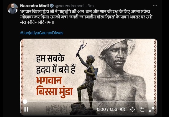 उल्लेखनीय है कि आज प्रधानमंत्री मोदी जनजातीय गौरव दिवस मनाने के लिए बिहार के जमुई पहुंच रहे हैं। इस मौके पर उनके सम्मान में स्मारक सिक्का और डाक टिकट जारी करने के अलावा कई परियोजनाओं की शुरुआत करेंगे। प्रधानमंत्री मोदी ने एक्स हैंडल पर भगवान बिरसा मुंडा का पुण्य स्मरण करते हुए एक वीडियो भी अपलोड किया है।