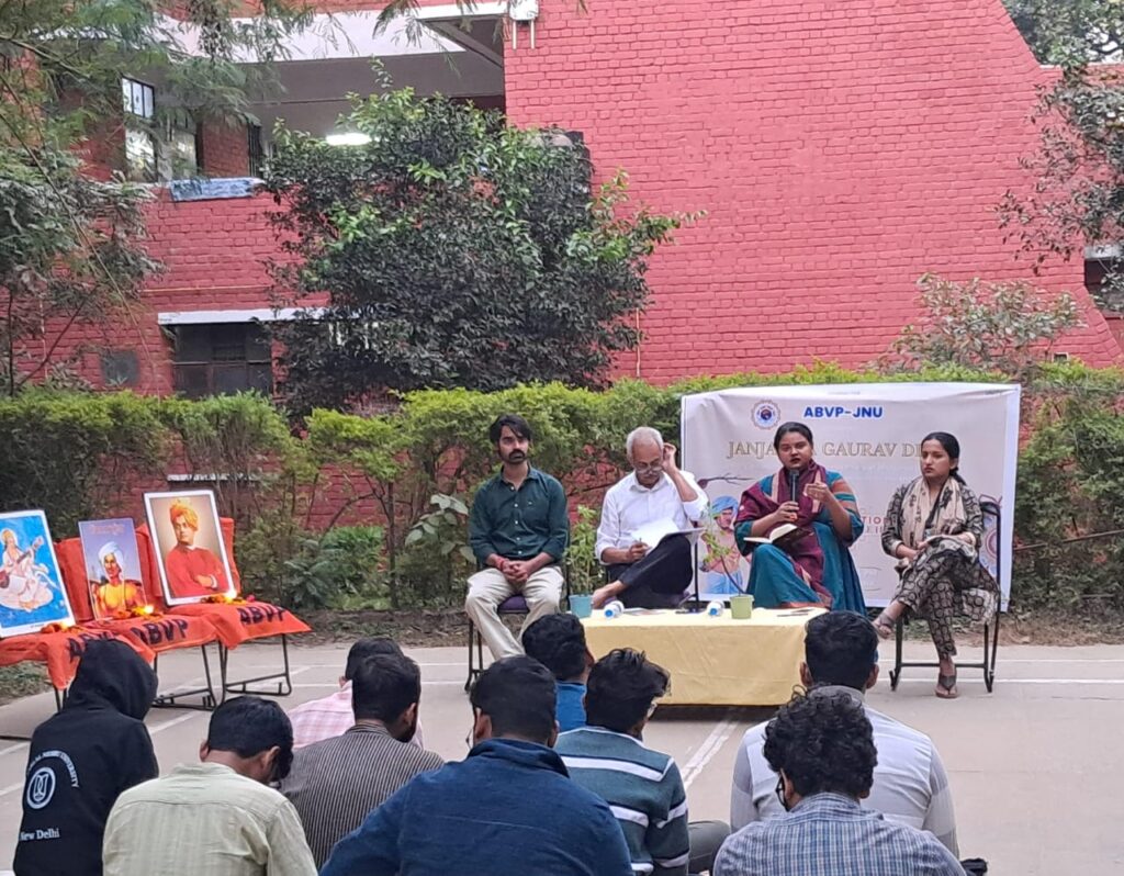 नई दिल्ली, 16 नवंबर । अखिल भारतीय विद्यार्थी परिषद (एबीवीपी), जेएनयू इकाई ने शनिवार को जनजातीय गौरव दिवस के अवसर पर एक विशेष टॉक का आयोजन किया। यह कार्यक्रम जेएनयू के साबरमती ढाबा पर आयोजित किया गया। जिसमें समाज और इतिहास के विविध पहलुओं पर चर्चा की गई।इस अवसर पर मुख्य वक्ता के रूप में प्रोफेसर हिमांशु रॉय और प्रोफेसर अदिति नारायणी ने भाग लिया। दोनों वक्ताओं ने जनजातीय समुदायों के इतिहास, उनकी संस्कृति, और भारतीय समाज में उनके योगदान पर गहन विचार साझा किए।