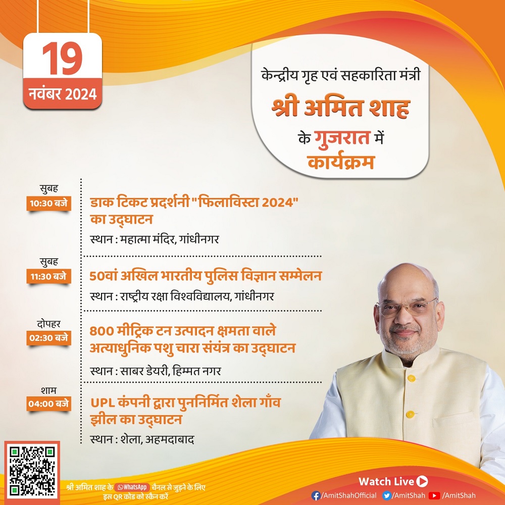 केंद्रीय गृह एवं सहकारिता मंत्री अमित शाह के कार्यक्रम की जानकारी उनके आफिस ने एक्स हैंडल पर साझा की है। शाह अहमदाबाद में शाम 4 बजे शेला झील का उद्घाटन करेंगे। शेला गांव की झील का पुनर्निमाण यूपीएल कंपनी ने कराया है। केंद्रीय मंत्री शाह इससे पहले पूर्वाह्न 11ः30 बजे गांधी नगर स्थित राष्ट्रीय रक्षा विश्वविद्यालय जाएंगे। वो यहां 50वें अखिल भारतीय पुलिस विज्ञान सम्मेलन में हिस्सा लेंगे।