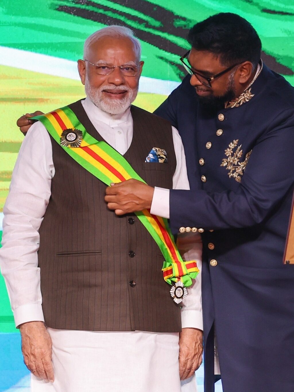 नई दिल्ली में आधिकारिक रूप से जानकारी दी गई कि प्रधानमंत्री नरेन्द्र मोदी गुयाना के सर्वोच्च राष्ट्रीय पुरस्कार से सम्मानित होने वाले चौथे विदेशी नेता हैं। यह पुरस्कार गुयाना के स्टेट हाउस में आयोजित समारोह में गुयाना के राष्ट्रपति डॉ. मोहम्मद इरफान अली ने प्रधानमंत्री मोदी को उनकी दूरदर्शी प्रतिभा के लिए प्रदान किया। यह सम्मान प्रधानमंत्री मोदी को वैश्विक मंच पर विकासशील देशों के अधिकारों की वकालत करने, वैश्विक समुदाय की असाधारण सेवा और भारत-गुयाना संबंधों को मजबूत करने की उनकी प्रतिबद्धता के लिए प्रधान किया गया। पुरस्कार स्वीकार करते समय प्रधानमंत्री मोदी ने इस सम्मान को भारत के लोगों और दोनों देशों के लोगों के बीच गहरे ऐतिहासिक संबंधों को समर्पित किया। उन्होंने इस बात पर जोर दिया कि उनकी राजकीय यात्रा भारत-गुयाना मित्रता को गहरा करने की दिशा में भारत की निरंतर प्रतिबद्धता का प्रमाण है।