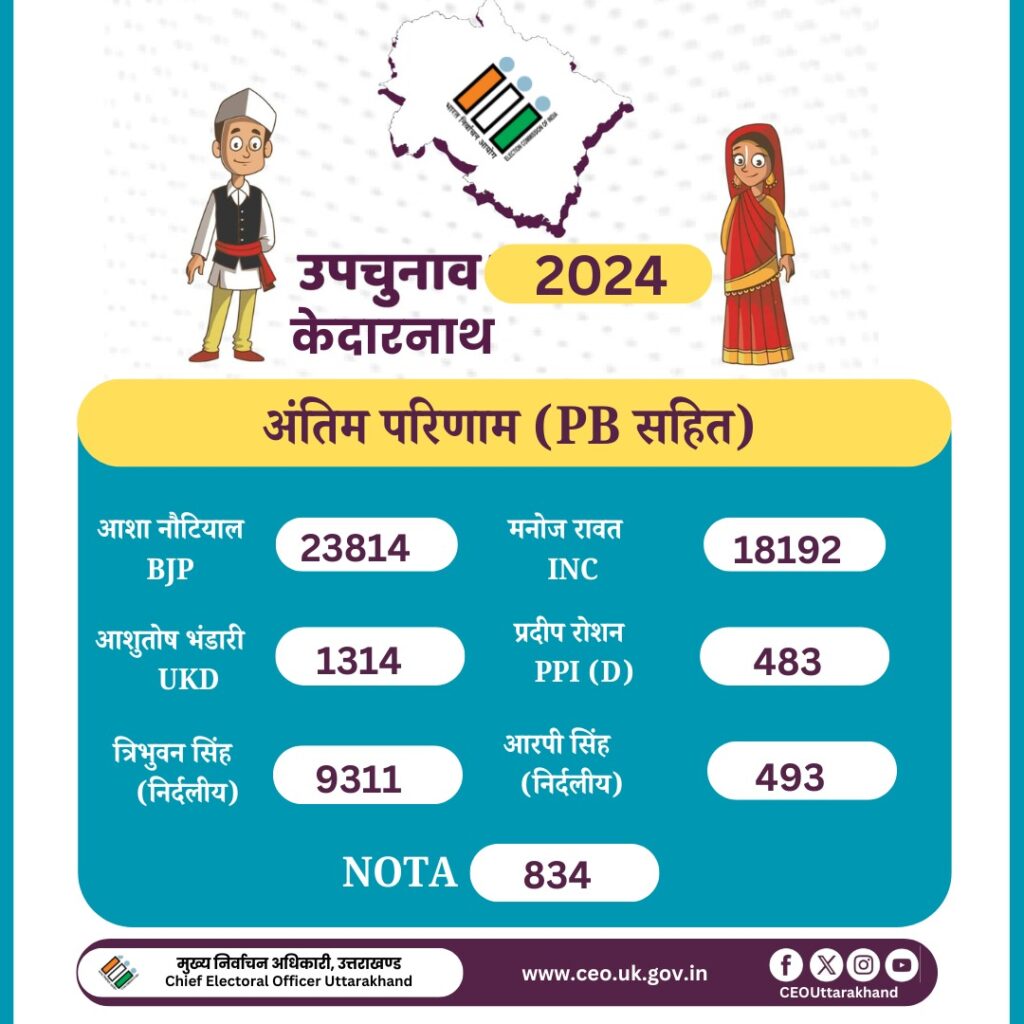 देहरादून, 23 नवंबर । भारतीय जनता पार्टी (भाजपा) की उम्मीदवार आशा नौटियाल ने शानदार प्रदर्शन करते हुए केदारनाथ विधानसभा उपचुनाव में 23,814 वोट हासिल कर जीत दर्ज की। उनके निकटतम प्रतिद्वंदी कांग्रेस उम्मीदवार मनोज रावत को 18,192 वोट मिले, जिससे आशा नौटियाल ने 5,622 वोटों के अंतर से विजय प्राप्त की।