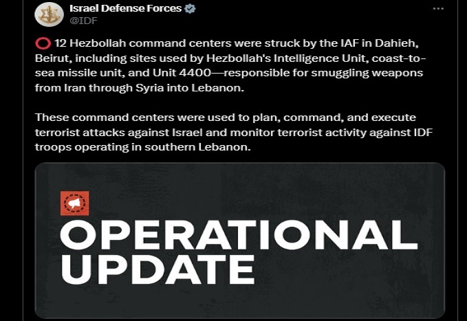 आईडीएफ के एक्स हैंडल में यह जानकारी दी गई। आईडीएफ ने कहा है कि इन कमांड सेंटरों पर ईरान से सीरिया के माध्यम से लाए गए हथियारों का जखीरा मौजूद था। इन सेंटरों में इजराइल के खिलाफ आतंकवादी हमलों की योजना बनाई जाती थी। उल्लेखनीय है कि दहीह, लेबनान के बाबदा जिले में बेरूत के दक्षिण का शिया मुस्लिम उपनगर है।