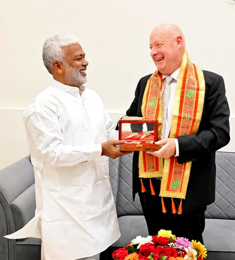 लखनऊ, 26 नवम्बर। भारत में डेनमार्क के राजदूत फ्रेडी स्वेन ने अपने विदाई कार्यक्रम से पहले मंगलवार को उत्तर प्रदेश में पुराने परिचितों से भेंट मुलाकात की। राजदूत फ्रेडी स्वेन ने उत्तर प्रदेश के जलशक्ति मंत्री स्वतंत्रदेव सिंह से शिष्टाचार भेंट करते हुए जल जीवन मिशन के कार्यो की जमकर सराहना की। जलशक्ति मंत्री स्वतंत्रदेव सिंह ने डेनमार्क के राजदूत फ्रेडी स्वेन को स्मृति चिन्ह भेंट स्वरूप देकर उनका अभिवादन किया। जलशक्ति मंत्री स्वतंत्रदेव सिंह ने डेनमार्क के राजदूत से हुई चर्चा के संबंध में हिन्दुस्थान समाचार से बताया कि आज सुबह मेरे सरकारी आवास पर डेनमार्क के राजदूत फ्रेडी स्वेन पधारें और उनसे तमाम बिन्दुओं पर चर्चा हुई। जिसमें उत्तर प्रदेश सहित देश में जल जीवन मिशन के कार्यो की चर्चा के दौरान उन्होंने जमकर सराहना किया।