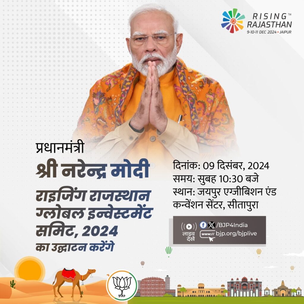 राजस्थान में प्रधानमंत्री का कार्यक्रमप्रधानमंत्री मोदी जयपुर में प्रदर्शनी एवं सम्मेलन केन्द्र (जेईसीसी) में राइजिंग राजस्थान ग्लोबल इन्वेस्टमेंट समिट 2024 और राजस्थान ग्लोबल बिजनेस एक्सपो का उद्घाटन करेंगे। वो इस अवसर पर लोगों को संबोधित भी करेंगे। 9 से 11 दिसंबर तक आयोजित होने वाले निवेश शिखर सम्मेलन का विषय ‘पूर्ण, जिम्मेदार, तैयार’ है। शिखर सम्मेलन में जल सुरक्षा, सतत खनन, सतत वित्त, समावेशी पर्यटन, कृषि-व्यवसाय नवाचार और महिलाओं के नेतृत्व वाले स्टार्टअप जैसे विषयों पर 12 क्षेत्रीय विषयगत सत्र आयोजित किए जाएंगे। शिखर सम्मेलन के दौरान आठ देशों के सत्र भी आयोजित किए जाएंगे जिसमें भाग लेने वाले देश ‘रहने योग्य शहरों के लिए जल प्रबंधन’, ‘उद्योगों की बहुमुखी प्रतिभा- विनिर्माण और उससे परे’ और ‘व्यापार और पर्यटन’ जैसे विषयों पर चर्चा करेंगे। इस अवधि में प्रवासी राजस्थानी कॉन्क्लेव और एमएसएमई कॉन्क्लेव भी आयोजित किए जाएंगे। राजस्थान ग्लोबल बिजनेस एक्सपो में राजस्थान मंडप, कंट्री मंडप, स्टार्टअप मंडप जैसे विषयगत मंडप शामिल होंगे। शिखर सम्मेलन में 16 भागीदार देशों और 20 अंतरराष्ट्रीय संगठनों सहित 32 से अधिक देश भाग लेंगे।