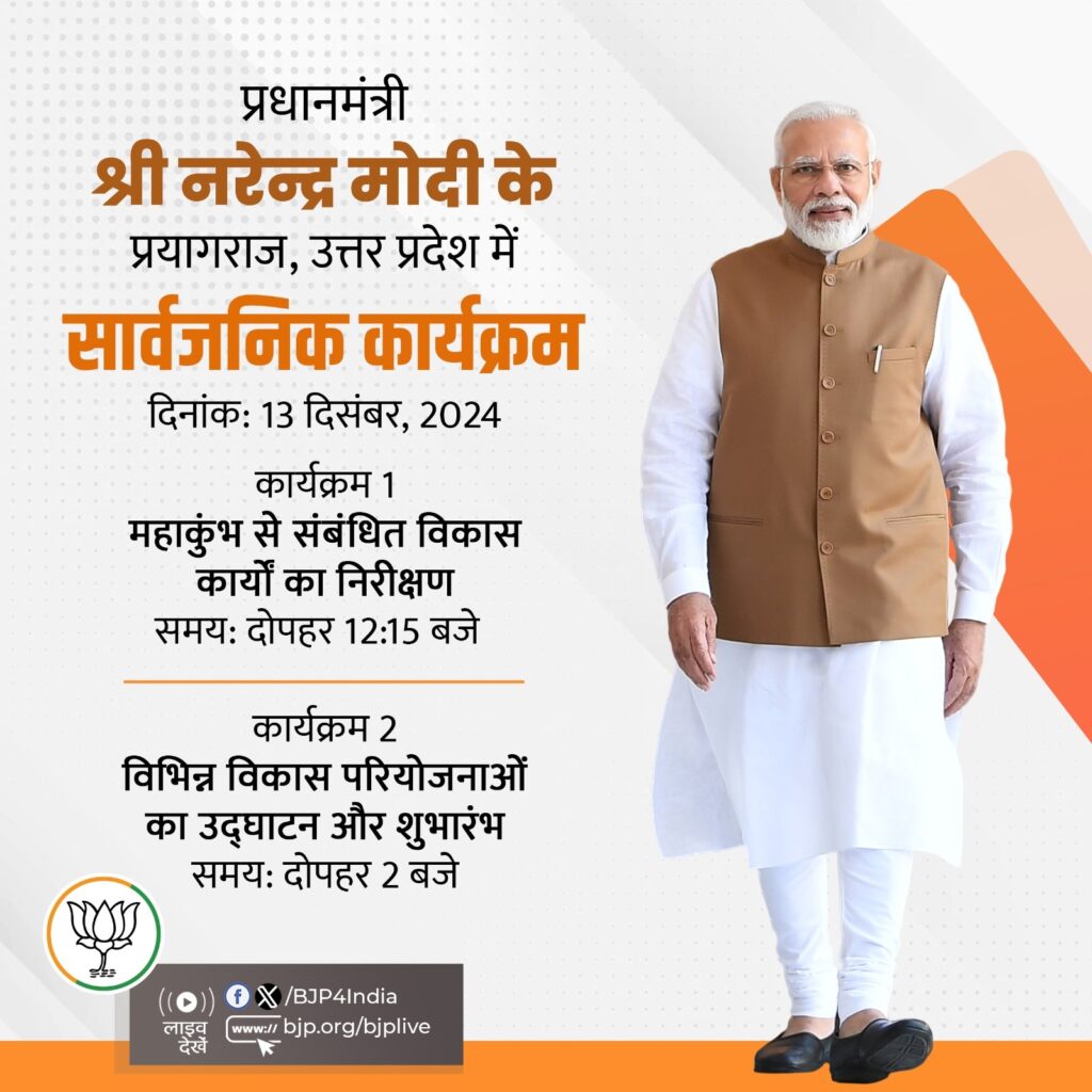 नई दिल्ली, 13 दिसंबर । प्रधानमंत्री नरेन्द्र मोदी आज उत्तर प्रदेश के प्रयागराज के दौरे पर पहुंच रहे हैं। इस दौरान वो महाकुंभ-2025 मेला क्षेत्र में की जा रही तैयारियों का निरीक्षण करेंगे। साथ ही 5500 करोड़ रुपये से अधिक की लागत वाली विकास परियोजनाओं का उद्घाटन करेंगे। भारतीय जनता पार्टी (भाजपा) ने प्रधानमंत्री मोदी के आज के इस कार्यक्रम की सूचना एक्स हैंडल पर साझा की है। भारत सरकार के पत्र एवं सूचना कार्यालय (पीआईबी) ने प्रधानमंत्री के प्रयागराज दौरे के कार्यक्रम की पूर्व संध्या पर जारी विज्ञप्ति में पूरा विवरण दिया है। पीआईबी की विज्ञप्ति के अनुसार, प्रधानमंत्री नरेन्द्र मोदी प्रयागराज में दोपहर करीब 12:15 बजे संगम में पूजा-अर्चना और दर्शन करेंगे। इसके बाद दोपहर करीब 12:40 बजे अक्षय वट वृक्षस्थल पर पूजा करेंगे। यहां से वो हनुमान मंदिर और सरस्वती कूप जाएंगे। दोपहर करीब 1:30 बजे वो महाकुंभ प्रदर्शनी स्थल का भ्रमण करेंगे। प्रधानमंत्री मोदी इसके बाद दोपहर करीब दो बजे प्रयागराज में लगभग 5500 करोड़ रुपये की लागत वाली कई विकास परियोजनाओं का उद्घाटन और शुभारंभ करेंगे।प्रधानमंत्री नरेन्द्र मोदी महाकुंभ 2025 के लिए विभिन्न परियोजनाओं का उद्घाटन करेंगे। इसमें प्रयागराज में आधारभूत सुविधाओं को बढ़ावा देने और निर्बाध संपर्क प्रदान करने के लिए 10 नए रोड ओवर ब्रिज (आरओबी) या फ्लाईओवर, स्थायी घाट और रिवरफ्रंट सड़कें जैसी विभिन्न रेल और सड़क परियोजनाएं शामिल होंगी।इसके बाद प्रधानमंत्री गंगा नदी की ओर जाने वाले छोटे नालों को रोकने, टैप करने, मोड़ने और उपचारित करने की परियोजनाओं का भी उद्घाटन करेंगे। इससे नदी में बिना उपचार वाले जल का गंगा नदी में पहुंचना पूरी तरह से रोक पाना सुनिश्चित होगा। वे पेयजल और बिजली से संबंधित विभिन्न इन्फ्रास्ट्रक्चर परियोजनाओं का भी उद्घाटन करेंगे।प्रधानमंत्री नरेन्द्र मोदी मंदिर के प्रमुख गलियारों का उद्घाटन करेंगे। इनमें भारद्वाज आश्रम गलियारा, श्रृंगवेरपुर धाम गलियारा, अक्षयवट गलियारा, हनुमान मंदिर गलियारा आदि शामिल हैं। इन परियोजनाओं से श्रद्धालुओं की पहुंच आसान होगी और आध्यात्मिक पर्यटन को भी बढ़ावा मिलेगा। साथ ही कुंभ सहायक चैटबॉट का भी शुभारंभ करेंगे। यह चैटबॉट महाकुंभ मेला 2025 के बारे में श्रद्धालुओं को मार्गदर्शन और कार्यक्रमों की नवीनतम जानकारी प्रदान करेगा।