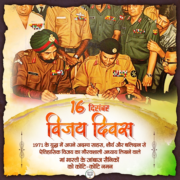 नई दिल्ली, 16 दिसंबर । प्रधानमंत्री नरेन्द्र मोदी, केंद्रीय गृह एवं सहकारितामंत्री और भारतीय जनता पार्टी (भाजपा) ने आज विजय दिवस पर 1971 की ऐतिहासिक जीत में अपना सर्वोच्च बलिदान करने वाले सैनिकों को श्रद्धांजलि अर्पित की। प्रधानमंत्री मोदी, गृहमंत्री शाह और भाजपा ने एक्स हैंडल पर मां भारती के सपूतों को कोटि-कोटि नमन किया।