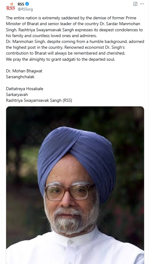 राष्ट्रीय स्वयंसेवक संघ ने एक्स हैंडल पर शोक संदेश जारी किया है। इसमें सरसंघचालक डॉ. मोहन भागवत और सरकार्यवाह दत्तात्रेय होसबाले को उद्धृत करते हुए लिखा गया, ”भारत के पूर्व प्रधानमंत्री और देश के वरिष्ठ नेता डॉ. सरदार मनमोहन सिंह के निधन से पूरा देश बेहद दुखी है। राष्ट्रीय स्वयंसेवक संघ उनके परिवार और अनगिनत प्रियजनों और प्रशंसकों के प्रति अपनी गहरी संवेदना व्यक्त करता है।”