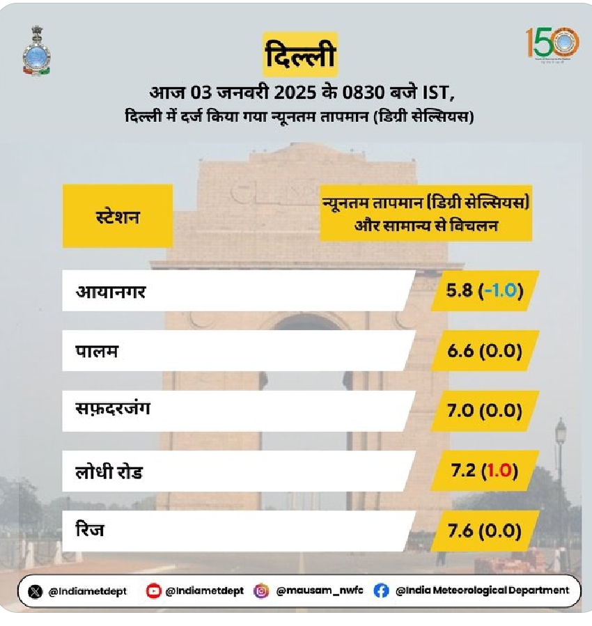 नई दिल्ली, 03 जनवरी । दिल्ली-एनसीआर में आज सुबह घना कोहरा छाया रहा, जिससे जनजीवन अस्त-व्यस्त हो गया। हाइवे पर चलने वाले लोगों को काफी परेशानी का सामना करना पड़ा। वहीं, ट्रेन और हवाई जहाज से सफर करने वालों को भी घंटों इंतजार करना पड़ा। इस बीच भारत मौसम विज्ञान विभाग (आईएमडी) ने शीतलहर को लेकर आज ऑरेंज अलर्ट जारी किया है। दिल्ली के आयानगर में न्यूनतम तापमान 5.6 डिग्री सेल्सियस रिकॉर्ड किया गया। यह सामान्य से एक डिग्री सेल्सियस कम है।