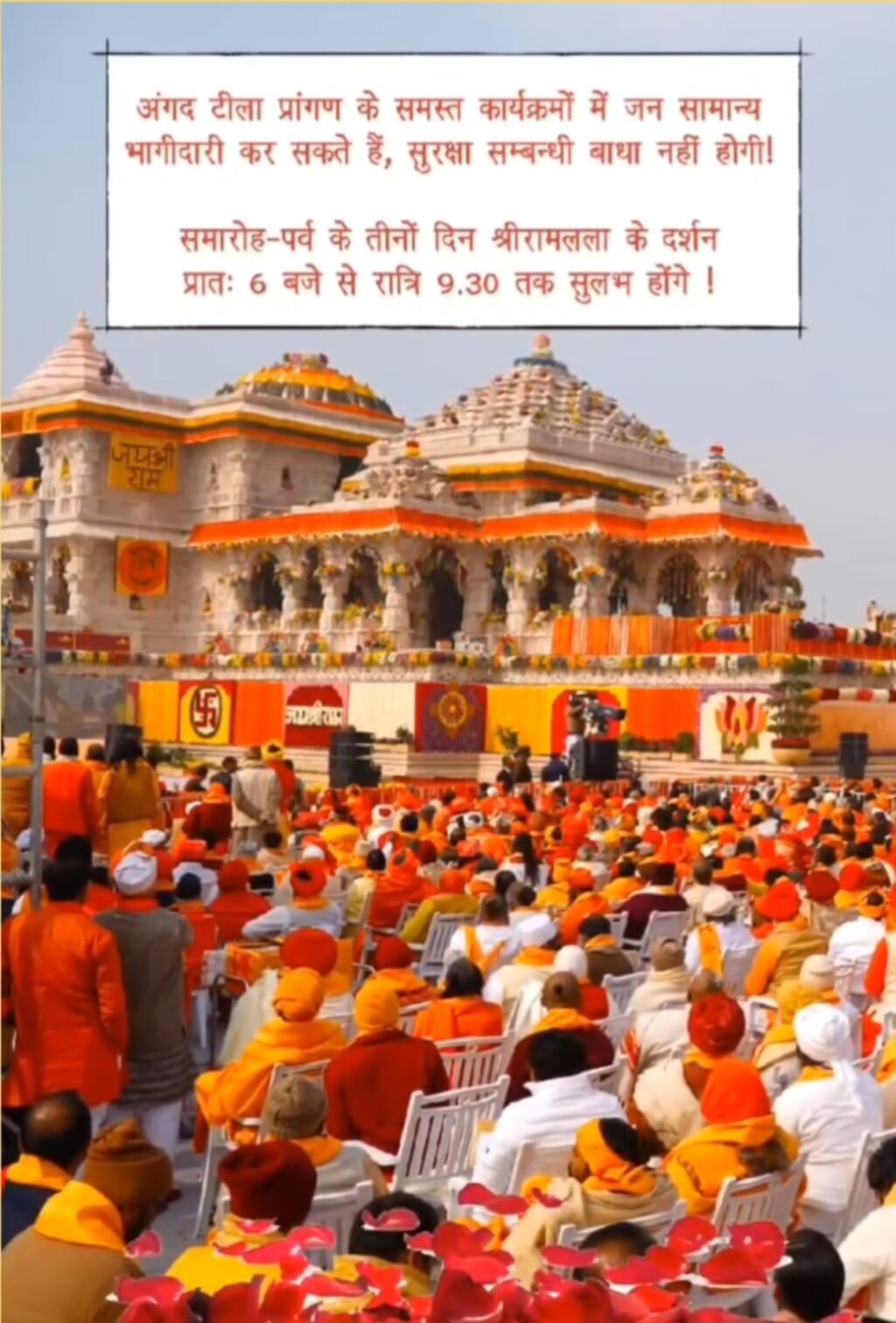 चतुर्थ स्थान अंगद टीला के मैदान में होंगे कार्यक्रम श्री चंपत राय ने बताया कि अंगद टीला के मैदान पर नित्य अपराह्न 2 से 3:30 बजे तक राम कथा और अपराह्न 3:30 से 5:00 बजे तक मानस पर प्रवचन होंगे। नित्य सायंकाल 5:30 से 7:30 बजे तक अन्य सांस्कृतिक कार्यक्रम होंगे। इसी स्थान पर 11 जनवरी को प्रातः काल से भगवान के भोजन प्रसाद का वितरण प्रारंभ होगा|उन्होंने बताया कि अंगद टीला के समस्त कार्यक्रमों में सम्पूर्ण समाज सादर आमंत्रित है। यहां सुरक्षा सम्बन्धी कोई बाधा / रोक टोक नहीं होगी ।
