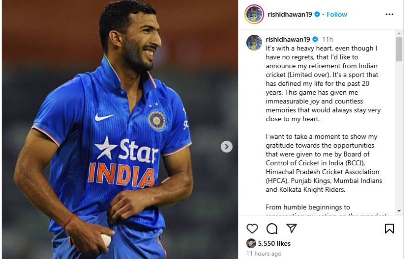 हालांकि, सोशल मीडिया हैंडल पर धवन की रिटायरमेंट की घोषणा में सीमित ओवरों के क्रिकेट का विशेष रूप से उल्लेख किया गया है, जिससे पता चलता है कि वह रणजी सीजन के शेष भाग में हिमाचल के लिए खेलने के लिए उपलब्ध रहेंगे।