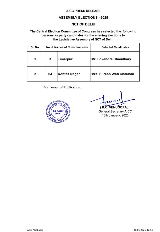 कांग्रेस ने तिमारपुर विधानसभा से लोकेंद्र चौधरी और रोहताश नगर विधानसभा से सुरेश चौहान को टिकट दिया गया है।
