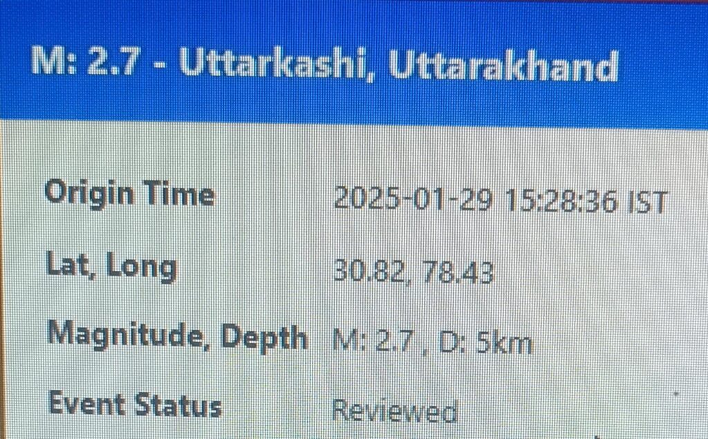 उत्तरकाशी, 29 जनवरी । उत्तरकाशी में आज अपराह्न 3:28 बजे एक बार फिर भूकंप के झटके महसूस किए गए। भूकंप की तीव्रता 2.8 मापी गई। भूकंप का केंद्र उत्तरकाशी से उत्तर दिशा में 10 किलोमीटर दूर बताया जा रहा है। उत्तरकाशी में बीते दिनों से लगातार भूकंप के झके महसूस किए जा रहे हैं। बीते कुछ दिनों में यह भूकंप का सातवां झटका था। जिला आपदा परिचालन केंद्र के अनुसार भूकंप से कोई जान—माल का नुकसान नहीं हुआ है। लगातार भूकंप के झटके महसूस होने से लोगों में डर का माहौल है।