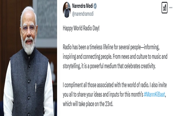 प्रधानमंत्री नरेंद्र मोदी ने आज विश्व रेडियो दिवस पर शुभकामनाएं दी हैं। सोशल मीडिया पर पोस्ट करते हुए प्रधानमंत्री ने कहा कि रेडियो कई लोगों के लिए एक शाश्वत जीवनरेखा रहा है, जो लोगों को जानकारी देता है, प्रेरित करता है और उन्हें जोड़ता है। उन्होंने कहा कि समाचार और संस्कृति से लेकर संगीत और कहानी कहने तक, रेडियो एक शक्तिशाली माध्यम है जो रचनात्मकता का जश्न मनाता है। श्री मोदी ने रेडियो की दुनिया से जुड़े सभी लोगों की भी सराहना की।