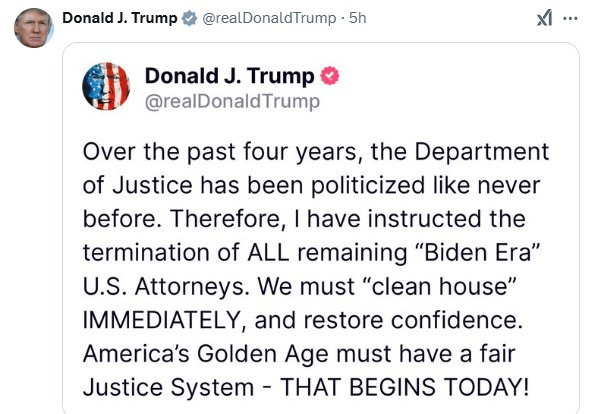 ट्रम्प ने अपने सोशल मीडिया पोस्ट में लिखा- “पिछले चार वर्षों में न्याय विभाग का जितना राजनीतिकरण हुआ है उतना कभी नहीं हुआ। इसलिए सभी बचे हुए ‘बाइडेन युग’ के अमेरिकी अटॉर्नी को बर्खास्त करने का निर्देश दिया गया है। हमें तुरंत ‘सफाई’ करनी चाहिए और विश्वास बहाली के लिए काम करना चाहिए। अमेरिका के स्वर्ण युग में एक निष्पक्ष न्याय प्रणाली होनी चाहिए- जिसकी शुरुआत आज से हो रही है।”