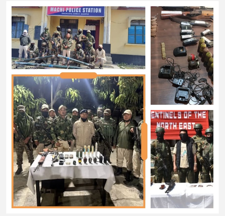 दूसरी कार्रवाई में मोरेह थाना क्षेत्र के माओजांग गांव से एक एके-56 राइफल, दो 9मिमी पिस्तौल (मैगज़ीन सहित), एक 40मिमी लाथोड गन, दो चीनी हैंड ग्रेनेड, दो अन्य ग्रेनेड, पांच हैंडसेट (तीन चार्जर सहित), चार हेडफोन, दो स्लिंग और एक केनबो बाइक जब्त की गई।