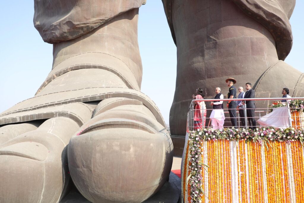 राजपीपला/अहमदाबाद, 27 फरवरी। राष्ट्रपति द्रौपदी मुर्मु ने नर्मदा जिले के एकतानगर में आज सरदार वल्लभभाई पटेल की विश्व की सबसे ऊंची 182 मीटर की प्रतिमा (स्टेच्यू ऑफ यूनिटी) का दौरा किया। उन्होंने सरदार साहब की विशाल प्रतिमा के चरणों पर पुष्प अर्पित कर श्रद्धांजलि अर्पित की। राष्ट्रपति के साथ राज्यपाल आचार्य देवव्रत और राज्य प्रोटोकॉल मंत्री जगदीश विश्वकर्मा और गण्यमान्य व्यक्तियों ने भी विश्व की सबसे बड़ी प्रतिमा की भव्यता देखी। सभी ने सरदार साहब की एकता, अखंडता और अटूट धैर्य की भावना का प्रत्यक्ष अनुभव किया। सागबारा और तिलकवाड़ा के आदिवासी भाई-बहनों ने मेवासी और होली नृत्य जैसे पारंपरिक आदिवासी नृत्यों के साथ एकता की दीवार पर राष्ट्रपति का स्वागत किया। उन्होंने प्रतिमा परिसर में स्थित प्रदर्शनी हॉल का अवलोकन किया। उन्होंने भारत की आजादी की गाथा, गुलामी से आजादी तक की यात्रा तथा भारत की एकता के लिए लौह पुरुष सरदार वल्लभ भाई पटेल के संघर्ष और योगदान के बारे में जानकारी प्राप्त की।राष्ट्रपति ने स्टेच्यू ऑफ यूनिटी की दर्शक दीर्घा से सरदार सरोवर, नर्मदा बांध और विंध्याचल-सतपुड़ा पर्वत शृंखला की प्राकृतिक सुंदरता को देखी। राष्ट्रपति मुर्मु बुधवार को महाशिवरात्रि के पावन पर्व पर नर्मदा की अतिथि बनीं। उन्होंने रात्रि विश्राम के बाद आज दूसरे दिन स्टेच्यू ऑफ यूनिटी का अवलोकन किया। इस अवसर पर एसएसएनएनएल के अध्यक्ष मुकेश पुरी, एसके मोदी, पुलिस अधीक्षक प्रशांत सुम्बे, एसओयू के सीईओ यज्ञेश्वर व्यास सहित उच्च अधिकारी उपस्थित रहे।