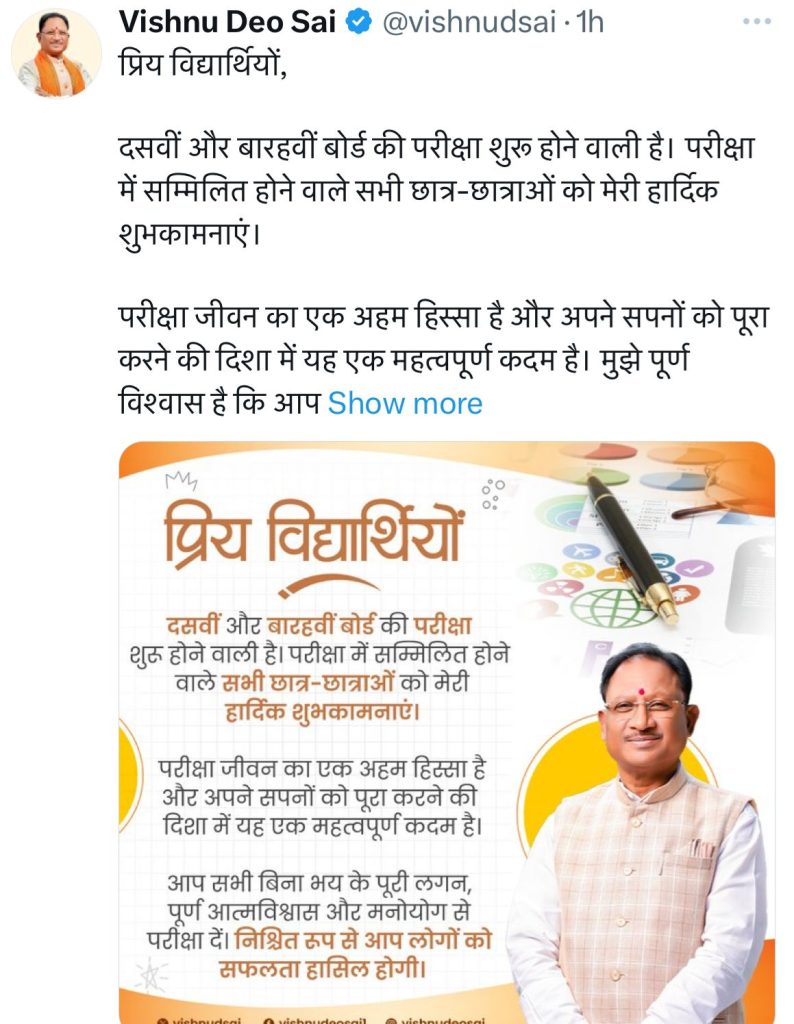 मुख्यमंत्री साय ने सोशल मीडिया एक्स पर कहा- प्रिय विद्यार्थियों, दसवीं और बारहवीं बोर्ड की परीक्षा शुरू होने वाली है। परीक्षा में सम्मिलित होने वाले सभी छात्र-छात्राओं को मेरी हार्दिक शुभकामनाएं. परीक्षा जीवन का एक अहम हिस्सा है। अपने सपनों को पूरा करने की दिशा में यह एक महत्वपूर्ण कदम है। मुझे पूर्ण विश्वास है कि आप सभी परीक्षार्थी अच्छी तैयारी किये होंगे। आप सभी बिना भय के पूरी लगन, पूर्ण आत्मविश्वास और मनोयोग से परीक्षा दें।निश्चित रूप से आप लोगों को सफलता हासिल होगी।