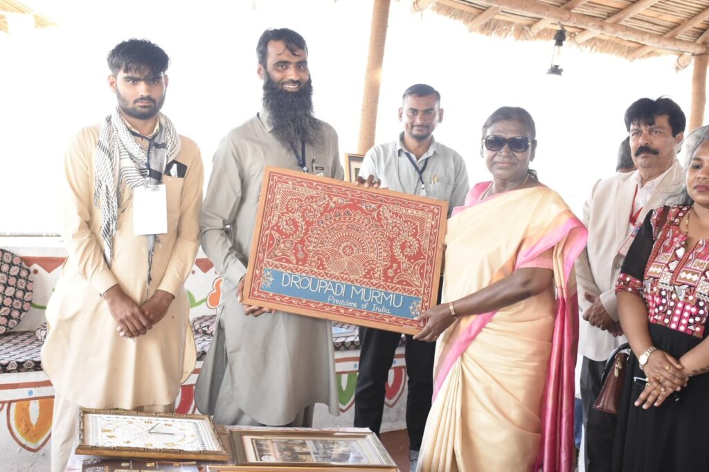 भुज/अहमदाबाद। कच्छ अपनी कला और शिल्प के लिए विश्व प्रसिद्ध है। कच्छ के दौरे पर आईं राष्ट्रपति द्रौपदी मुर्मु ने धोरडो में कच्छ की पारंपरिक कला और शिल्प से जुड़े कलाकारों से बातचीत की। इस यात्रा के दौरान, उन्होंने कच्छ रोगन कला, मिट्टी का काम, कढ़ाई का काम और बुनाई के काम सहित शिल्प कौशल का प्रत्यक्ष अवलोकन किया और कच्छ शिल्प कौशल को प्रदर्शित करने वाले हस्तशिल्प के विभिन्न स्टॉलों का दौरा किया।
