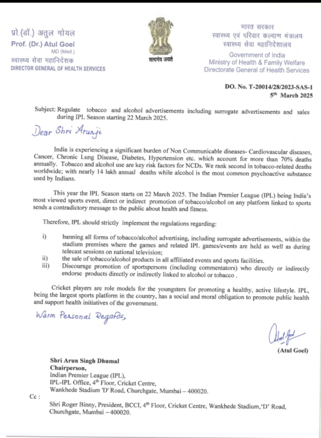 डीजीएचएस ने लिखा कि इस साल आईपीएल सीज़न 22 मार्च 2025 से शुरू हो रहा है। आईपीएल भारत का सबसे अधिक देखा जाने वाला खेल आयोजन है। खेल से जुड़े किसी भी मंच पर तम्बाकू/शराब का प्रत्यक्ष या अप्रत्यक्ष प्रचार स्वास्थ्य और फिटनेस के बारे में जनता को एक विरोधाभासी संदेश संप्रेषित करता है।