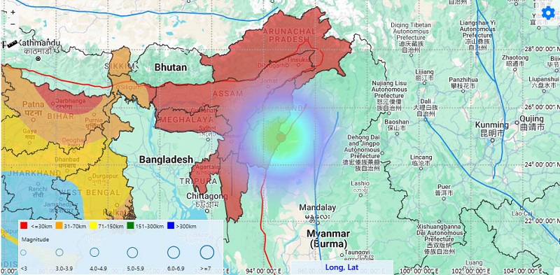 दरअसल, शुक्रवार काे भारत के मेघालय और मणिपुर में आए भूकंप से पहले और बाद में पड़ोसी देश म्यांमार में लगभग चार घंटे में छह बार भूकंप के झटके लगे हैं। जिसमें दो बार की तीव्रता 7 या 7 से अधिक दर्ज की गयी है। भारतीय सिस्मोलॉजी विज्ञान केंद्र के अनुसार पड़ोसी देश म्यांमार में सबसे पहला झटका 11.50 मिनट पर 7.5 तीव्रता का था। इसके बाद 12.02 मिनट पर 7.0 तीव्रता का, 12.57 मिनट पर 5.0 तीव्रता का, फिर 1.07 पर 4.9 तीव्रता का, 2.48 मिनट पर 4.4 तीव्रता और 3.25 पर 4.3 तीव्रता का छठा झटका महसूस किया।