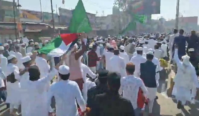लखनऊ, 31 मार्च । इजरायल के खिलाफ लड़ाई लड़ रहे फिलिस्तीन के झंडे लहराने का मामला सामने आया है। उत्तर प्रदेश के जिला सहारनपुर के घंटाघर क्षेत्र में ईद-उल-फितर के दिन बड़ी संख्या में मुस्लिम युवाओं का जुटना हुआ। मुस्लिम युवाओं ने फिलिस्तीन का झंडा लहराया और नारेबाजी भी की। इस दौरान एक युवक को गाजा लिखी हुई टी-शर्ट पहने हुए देखा गया। एसएसपी ने कहा है कि सीसीटीवी फुटेज से पहचान कर कड़ी कार्रवाई की जाएगी।