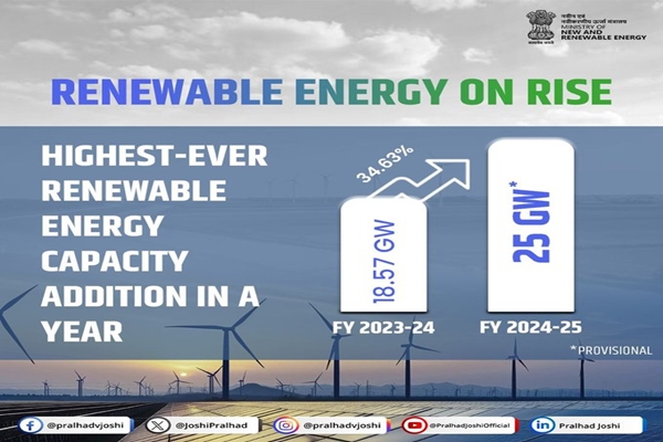 भारत के अक्षय ऊर्जा क्षेत्र ने पिछले वित्त वर्ष में 25 गीगावाट स्थापित करके अब तक की सबसे अधिक क्षमता वृद्धि हासिल की है। नवीन एवं नवीकरणीय ऊर्जा मंत्री प्रल्हाद जोशी ने कल नई दिल्ली में एक संवाददाता सम्मेलन को संबोधित करते हुए यह जानकारी दी। उन्होंने कहा कि पिछले वित्त वर्ष में इस क्षेत्र में लगभग 35 प्रतिशत की वृद्धि देखी गई, जबकि वित्त वर्ष 2023-24 में 18.57 गीगावाट की वृद्धि हासिल की गई। मंत्री ने इस बात पर प्रकाश डाला कि अक्षय ऊर्जा में देश की यात्रा का नेतृत्व सौर ऊर्जा ने किया, जो पिछले वित्त वर्ष में 15 से बढ़कर लगभग 21 गीगावाट हो गई। उन्होंने कहा कि इसमें लगभग 38 प्रतिशत की प्रभावशाली वृद्धि दर्ज की गई। श्री जोशी ने कहा कि परिवहन क्षेत्र और घरेलू घरों को कार्बन मुक्त करने के लिए संपीड़ित प्राकृतिक गैस और पाइप्ड प्राकृतिक गैस के साथ संपीड़ित बायोगैस के मिश्रण के लिए बायोसीएनजी की शुरूआत अनिवार्य की जाएगी। उन्होंने कहा कि इस अवधि के दौरान भारत की सौर पीवी सेल निर्माण क्षमता भी 9 गीगावाट से लगभग तीन गुना बढ़ गई। उन्होंने बताया कि पीएम कुसुम योजना ने भी भौतिक और वित्तीय दोनों ही पहलुओं के संदर्भ में अच्छी प्रगति की है। श्री जोशी ने इस बात पर भी जोर दिया कि पीएम सूर्य घर मुफ्त बिजली योजना के शुभारंभ के बाद से 1.1 लाख से अधिक परिवारों को लाभ मिला है और पिछले वित्तीय वर्ष में लगभग 7 लाख रोजगार सृजित हुए हैं।